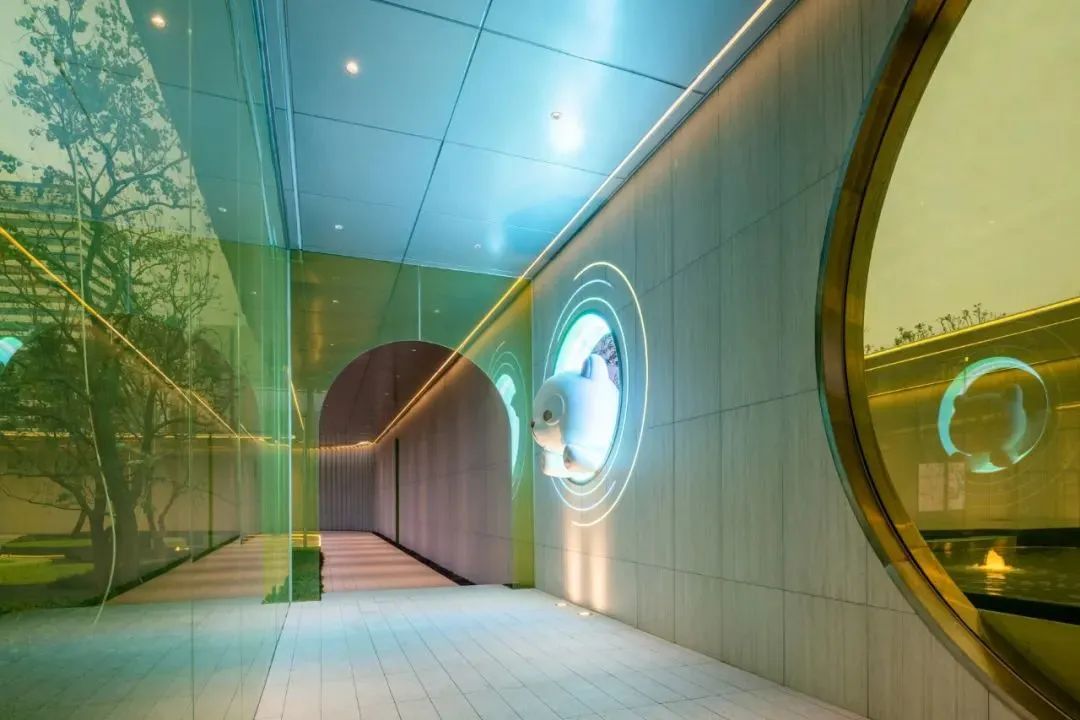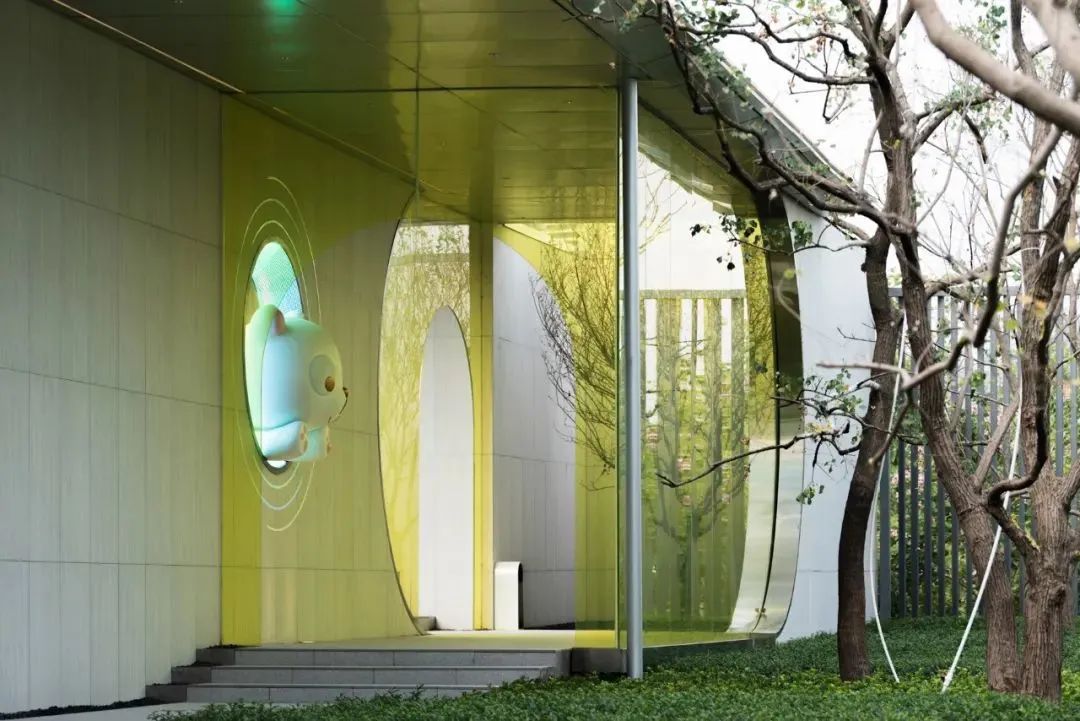 要說最吸睛,最彰顯出年輕而前衛的審美品味的,莫屬于青黃色拱形玻璃立板,打破了傳統庭院的莊重和嚴肅,而添置的小熊形象,更是增添了無窮的趣味,充滿了設計考量。有活力且向公共開放的高品質商業建筑,表達獨特的美學追求與鮮明個性。