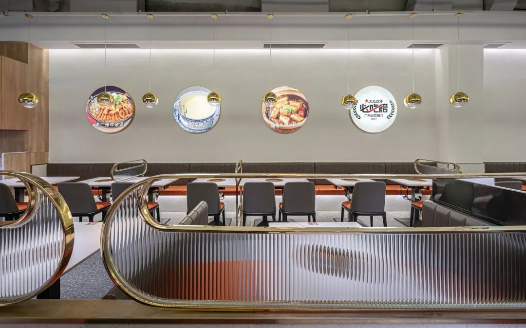 本案空間為長條形空間布局,Mo?意大利灰時尚水磨石的溫潤打底,在自然光和人工照明的配合下,具有的儀式感和藝術感。木色防火板提升空間溫度,牛角造型隔斷讓用餐變得精致有趣,不銹鋼配亞克力的架構則注入絲絲硬朗風,陣列的牛角磚更是空間和品牌文化的又一次呼應……
